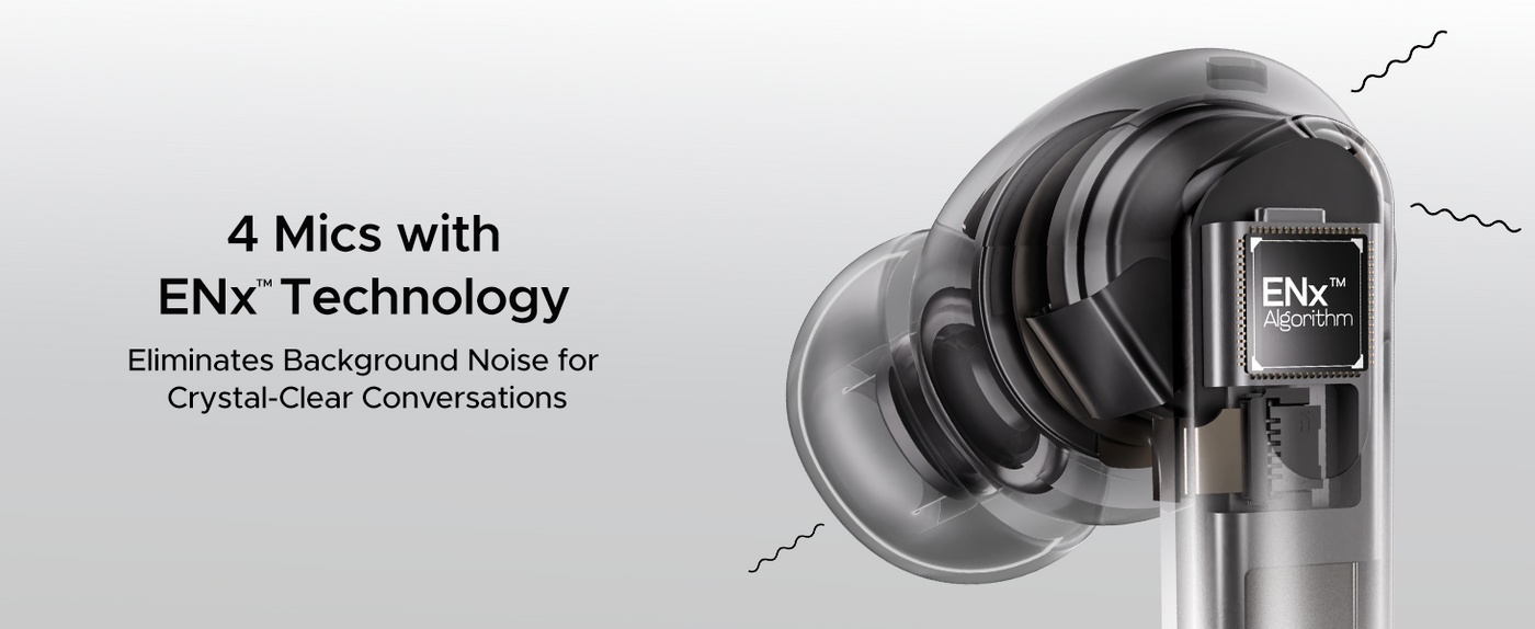 - Quad Mics with ENx Technology: Enjoy calls with high clarity indoors or on the go with the boAt Airdopes 111v2 TWS Earbuds. ENx-powered quad mics cancel background noise so you won’t have to search for a quiet spot.