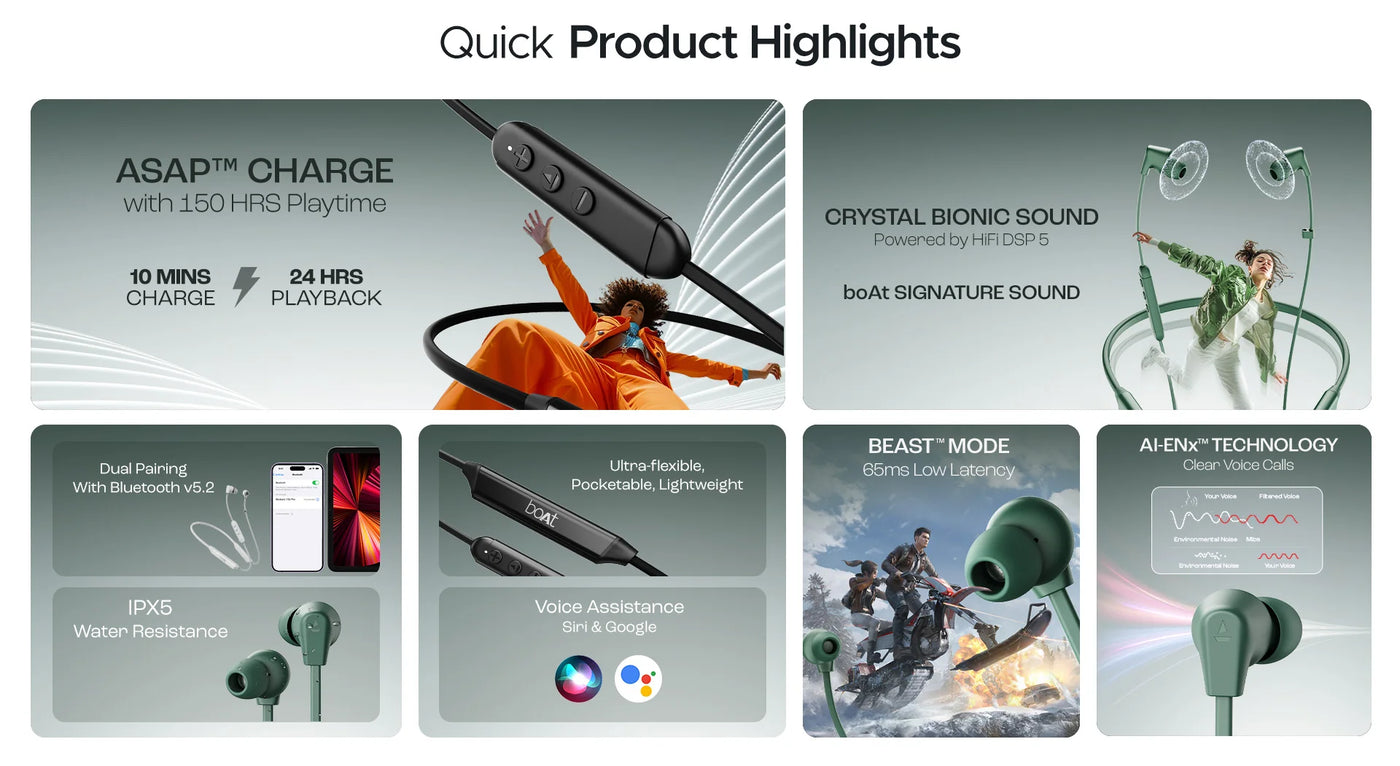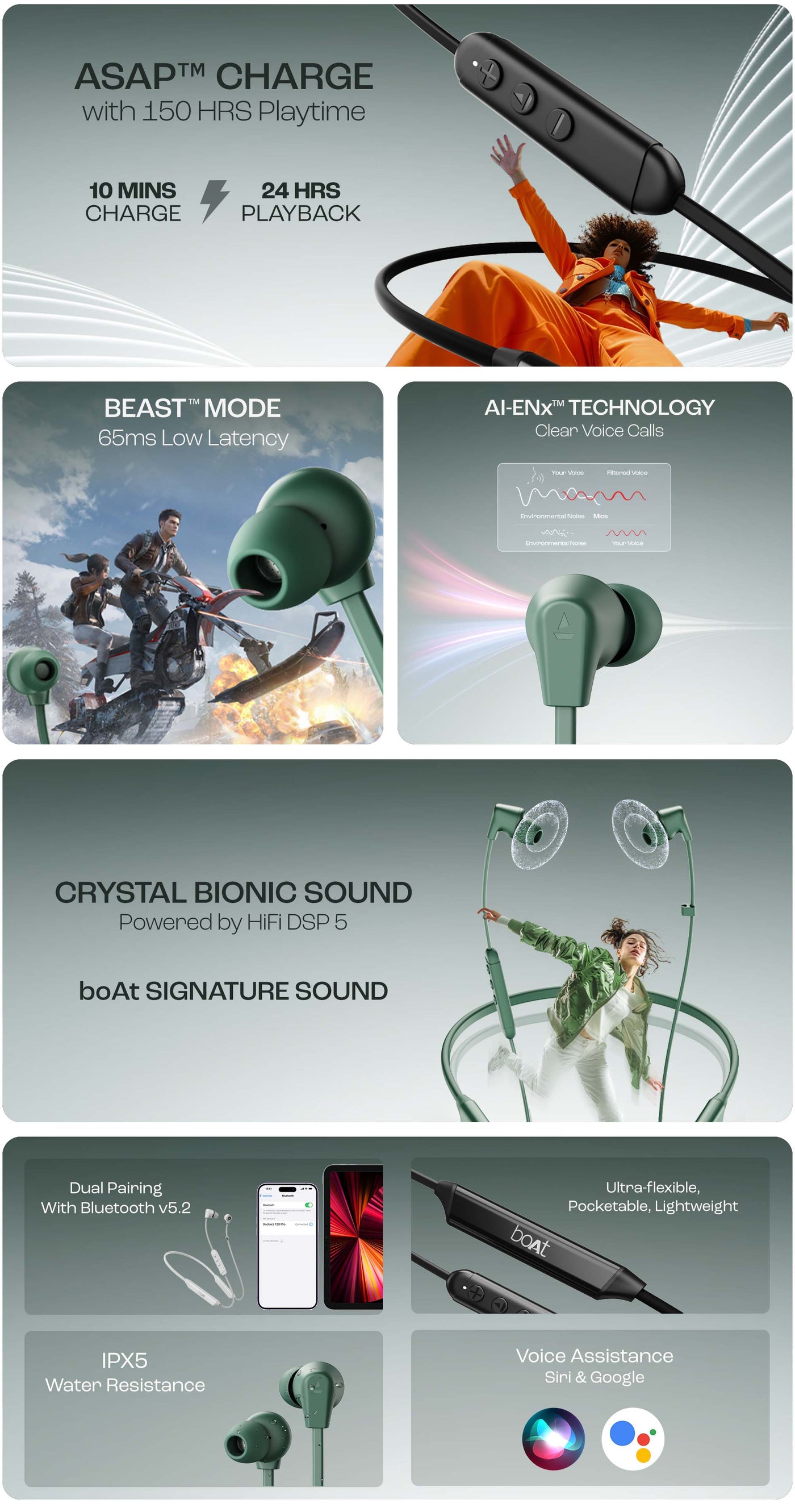 - ASAP Charge- Donβt let low battery play spoilsport to your entertainment. Featuring ASAP Charging, these earphones can boost the playtime by about 10 hours with just 10 minutes of charging.