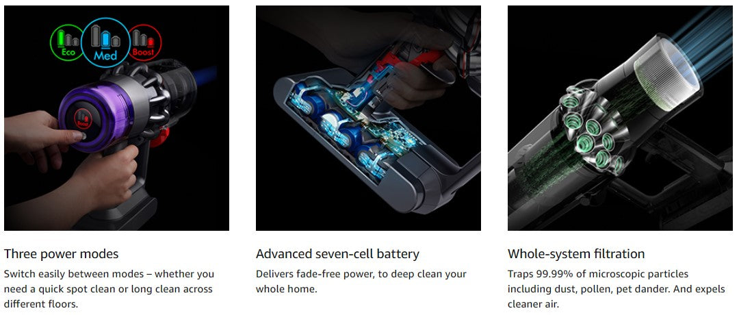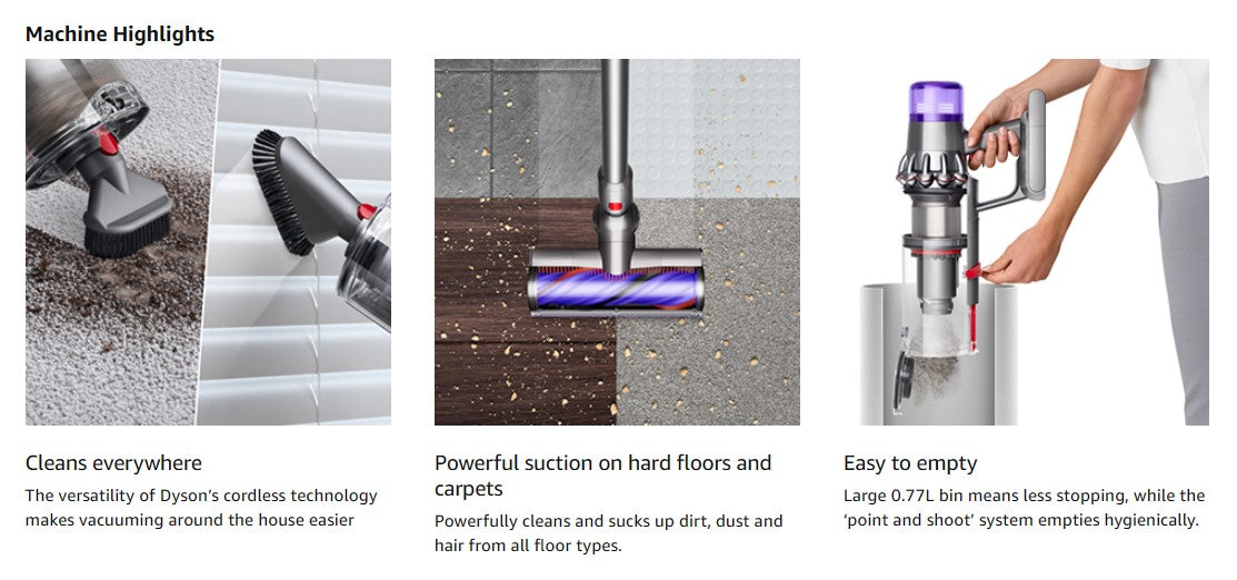 With up to 60 minutes of fade-free runtime, the Dyson V11 ensures efficient cleaning across large spaces. The high-capacity 0.77L bin features a hygienic "point and shoot" mechanism for mess-free dust disposal. Whole-machine filtration captures 99.97% of particles as small as 0.3 microns, making it ideal for allergy-prone homes.