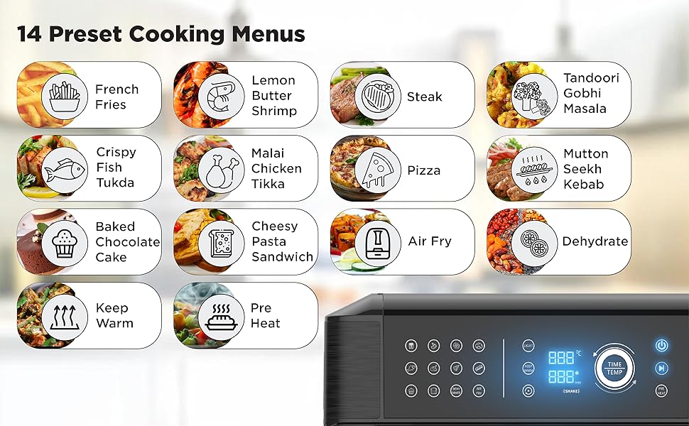 Featuring a generous 15 litre capacity this multifunction air fryer oven is ideal for families and gatherings, allowing you to prepare large batches of food in one go. The digital touch control panel offers 14 preset cooking modes so you can easily prepare fries, kebabs, pizza, chicken, and baked items with precision temperature and timer settings.