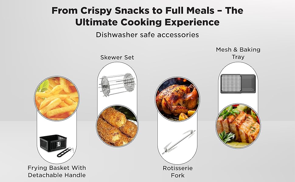 - Includes skewer set, rotisserie fork, mesh & baking tray