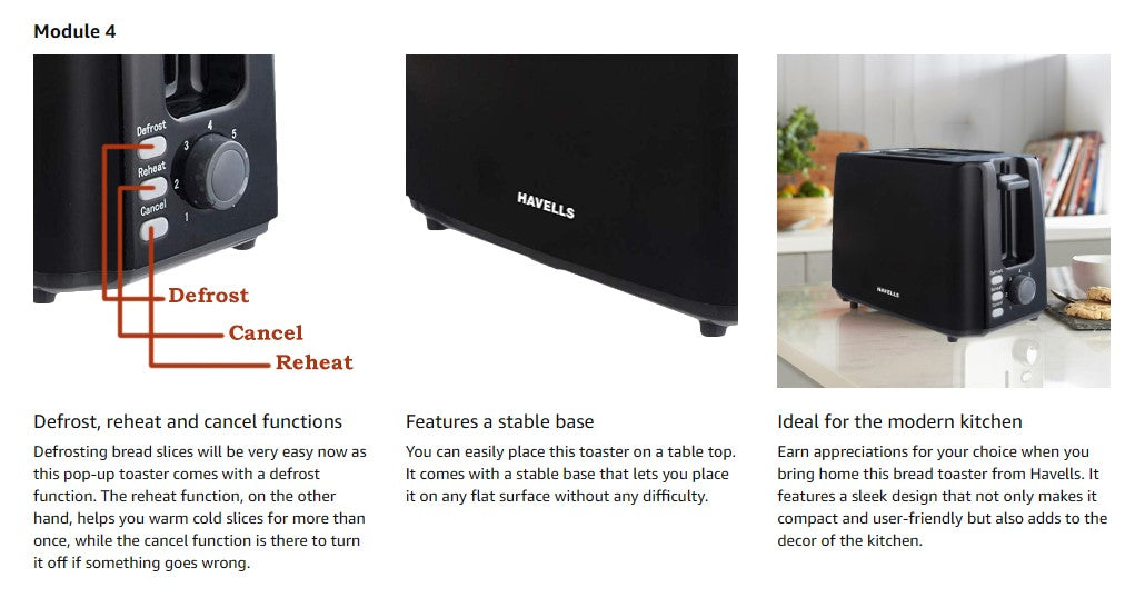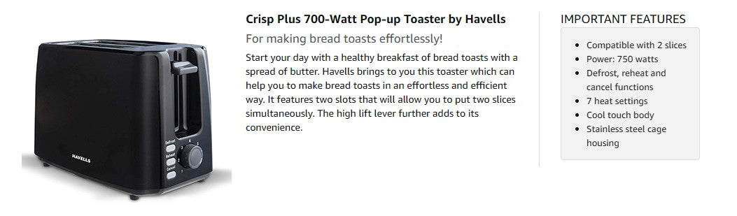 Havells Crisp Plus 2 Slice Pop Up Toaster offers reliable performance, multiple functions and user‑friendly features to make toast and bread snacks effortlessly every day.