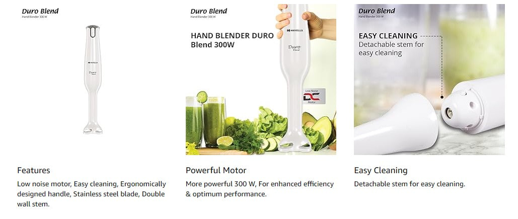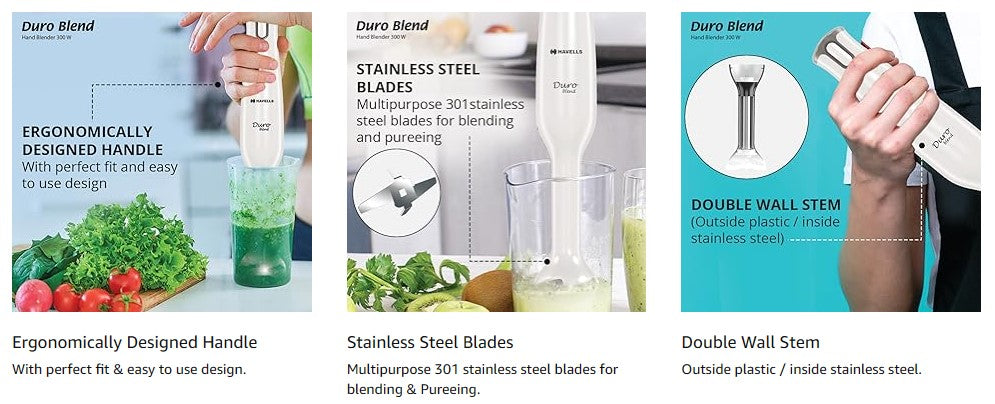 Havells Duro Hand Blender Double Bush Technology is a powerful and reliable kitchen appliance built to simplify your everyday blending tasks. At 300 W, its copper DC motor delivers efficient performance and smooth blending for soups, juices, purees, chutneys and more. The standout feature of this hand blender is the advanced Double Bush Technology which enhances stability, reduces vibration and ensures long-lasting performance even during frequent use.