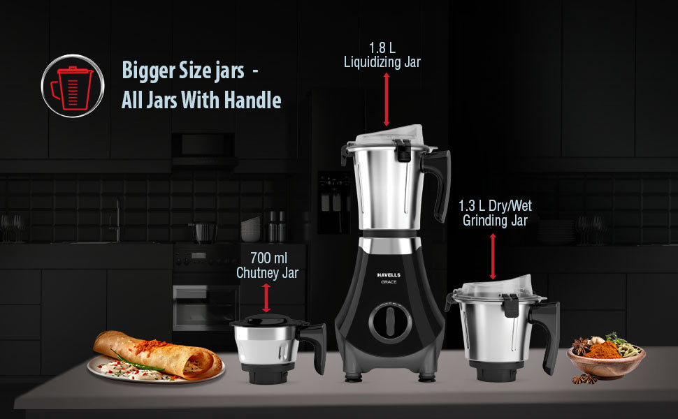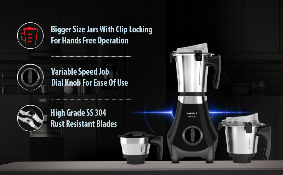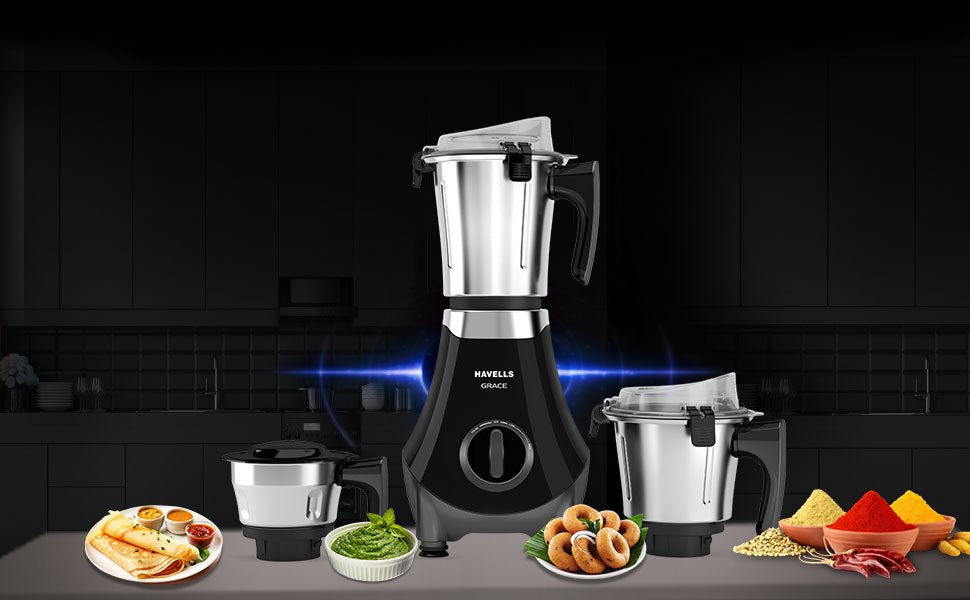 Havells Grace BLDC+ 800W Mixer Grinder combines power, quieter operation and practicality to make everyday grinding and blending efficient and effortless.