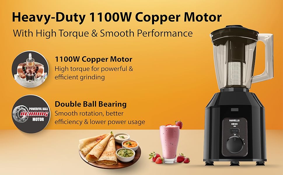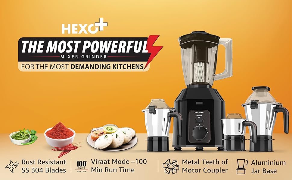 Havells Hexo Plus 1100W 4 Jar Mixer Grinder blends power, versatility and durability to make everyday kitchen grinding fast and efficient. :contentReference[oaicite:4]{index=4}