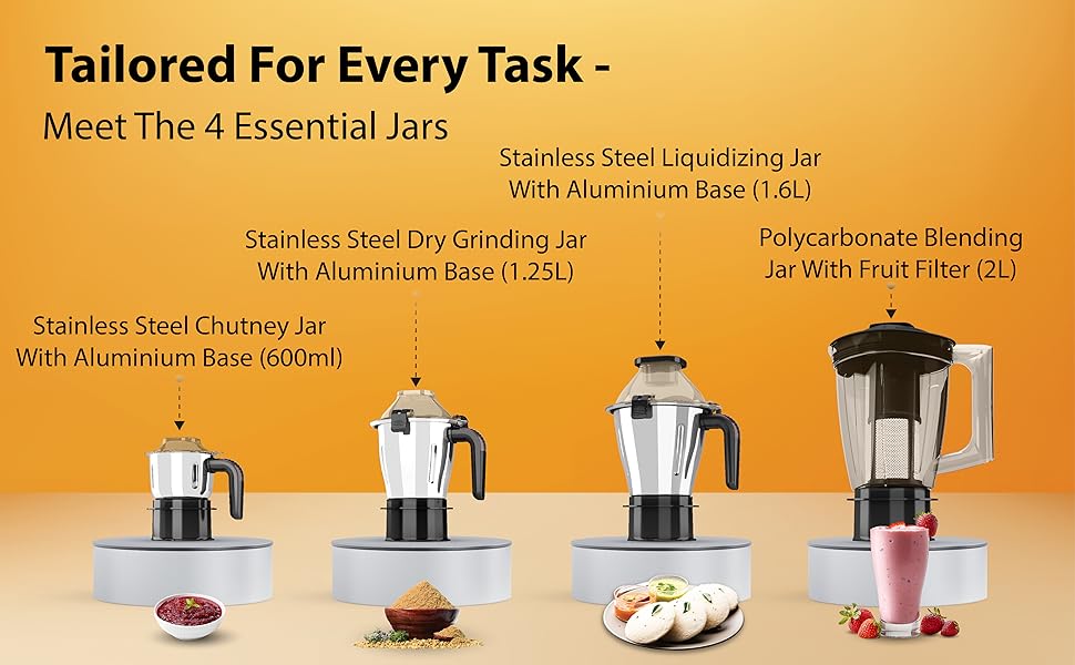 This model comes with 4 premium jars designed for diverse kitchen needs — including a 2 L break‑resistant blending jar, a 1.6 L liquidizing jar, a 1.25 L dry/wet grinding jar and a 600 ml chutney jar. Each jar features robust stainless steel blades and wider mouths for easy ingredient addition and cleaning, ensuring uniform and smooth results. :contentReference[oaicite:2]{index=2}