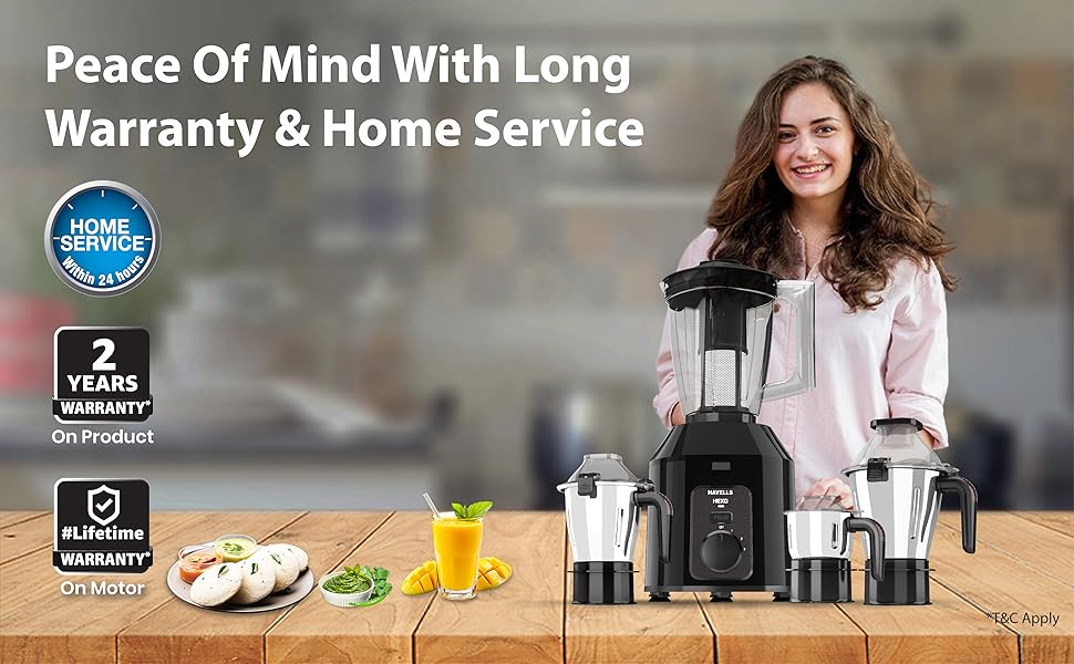 Havells Hexo Plus 1100W 4 Jar Mixer Grinder is engineered for continuous use with a motor rated for up to 100 minutes of runtime without overheating. The intuitive rotary controls with 3‑speed and pulse settings let you customize grinding intensity for different ingredients. Its sturdy ABS body and metal jar bases provide durability, while the ergonomic handles on the jars offer secure grip and comfort during use. Backed by a 5‑year motor warranty from Havells, this appliance brings long‑lasting performance and peace of mind to your kitchen. :contentReference[oaicite:3]{index=3}
