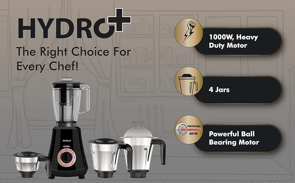 Havells Hydro Plus 1000W 4 Jar Mixer Grinder is a powerful and versatile kitchen appliance designed to handle daily grinding, blending and mixing tasks efficiently. Equipped with a robust 1000 W high‑speed motor that runs up to 22,000 RPM, it delivers fast and consistent performance for wet grinding, dry grinding and chutney making. The sleek black design adds a modern touch to your kitchen countertop while providing reliable utility. :contentReference[oaicite:2]{index=2}