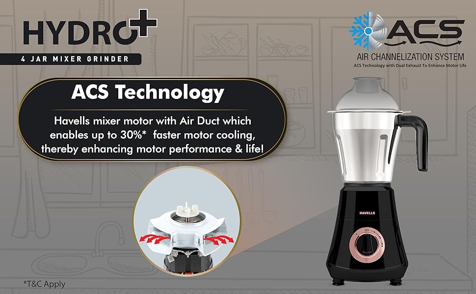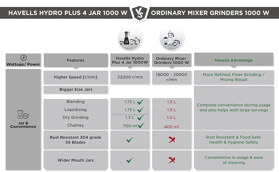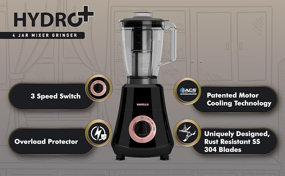 Havells Hydro Plus 1000W 4 Jar Mixer Grinder features superior SS‑304 grade stainless steel blades that are rust‑resistant and deliver uniform grinding results for a variety of ingredients. Its sturdy ABS body and ergonomic controls make it easy to use every day. With thoughtful airflow and motor cooling systems for extended life, this mixer grinder is ideal for Indian kitchens of all sizes. :contentReference[oaicite:4]{index=4}