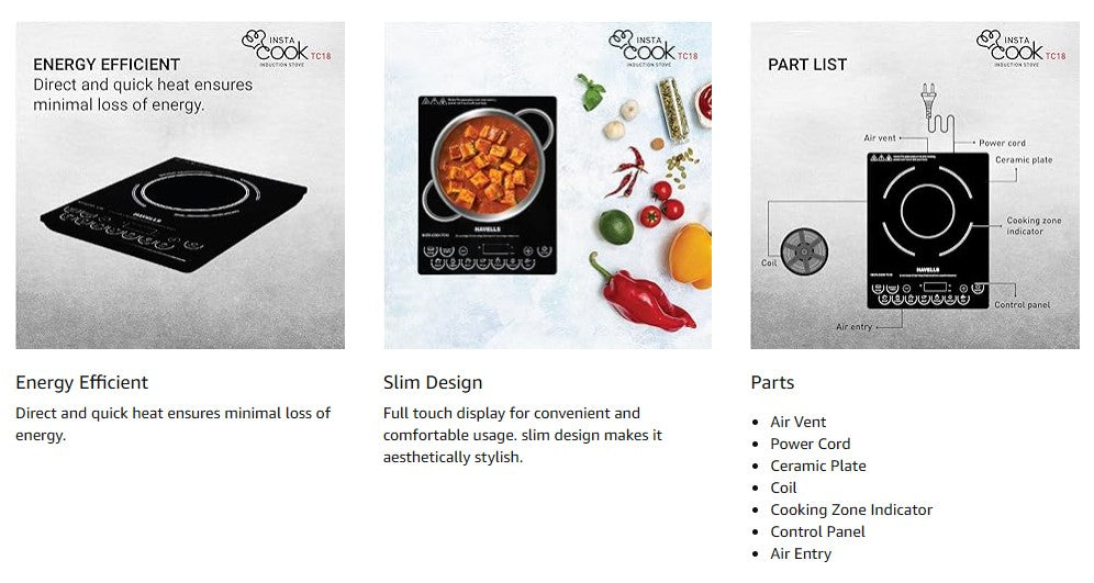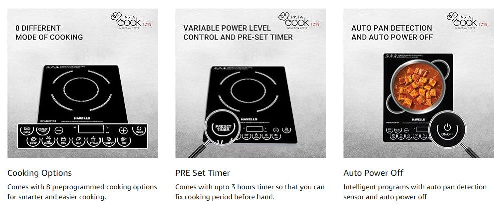 Havells Insta Cook TC18 Induction Cooktop is a powerful and feature-rich cooking appliance designed to make everyday meals faster, safer and more convenient. With an 1800 W high-power output, this induction cooktop heats up quickly and delivers consistent cooking performance for boiling, simmering, frying and more. Its sleek black ceramic glass surface enhances your kitchenโs aesthetics and makes cleaning effortless.