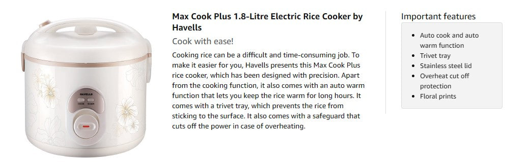 Havells Max Cook Plus Rice Cooker 1.8L