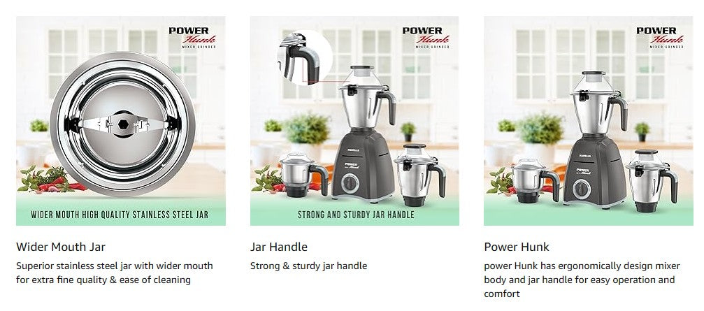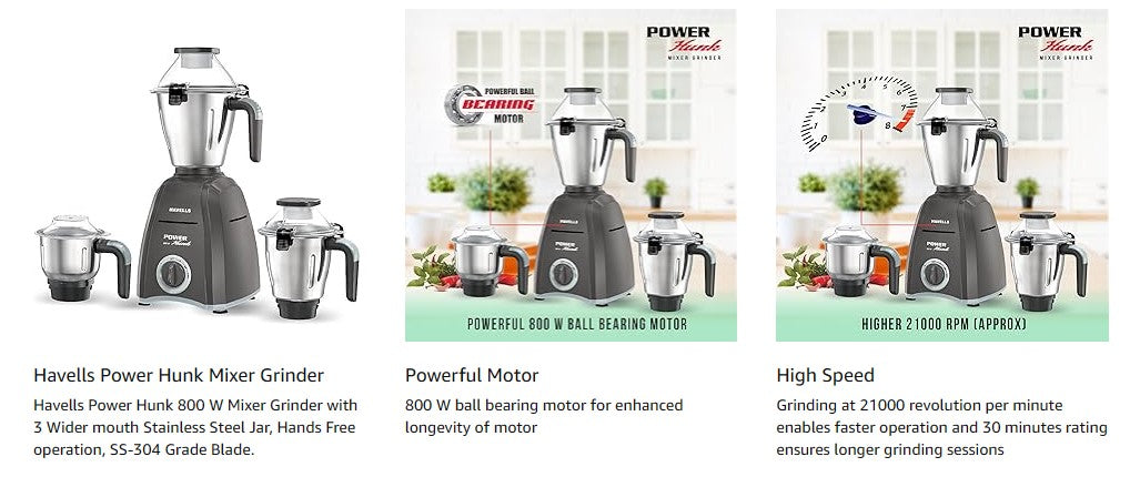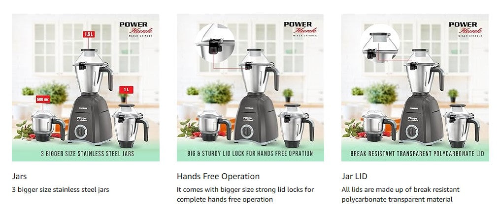 Havells Power Hunk 800W Mixer Grinder also offers hands‑free operation with strong lid locks and ergonomic jar handles for comfortable use. Its efficient high‑speed motor runs at approximately 21000 RPM and is rated for safe, extended grinding sessions. Backed by a long motor warranty and reliable construction, this mixer grinder combines performance, versatility and convenience for everyday kitchens.