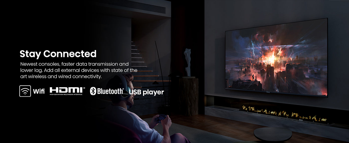- Connectivity: 3 HDMI ports to connect set top box (HDMI 3 eARC supported) | 2 USB 2.0 ports to connect hard drives and other USB devices | Built-in Dual Bands Wi-Fi | Bluetooth 5.3 | 1 RJ45 connector | 1 earphone Jack | 1 Optical digital audio output (SPDIF) | 1 RF- Radio frequency inputs | 1 AV input