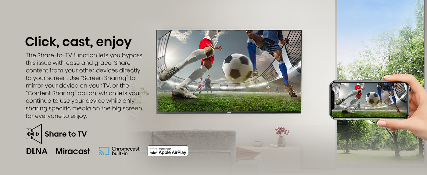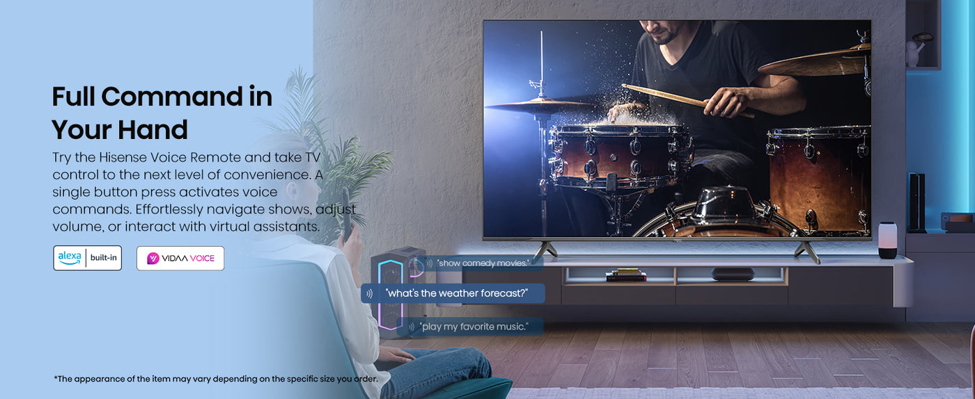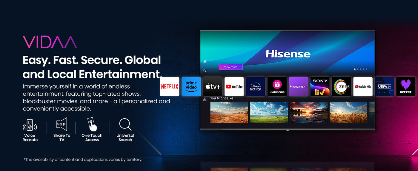 - Smart TV Features: VIDAA TV | Built-in VIDAA Voice Control | Built-in Amazon Alexa | Voice assistant via TV(Far field) and Remote | Screen Sharing | Airplay 2 | AI Picture Quality | Sleep Timer | Media Player | Supported Apps: Netflix, YouTube, Prime Video, Hotstar, SonyLiv, Hungama, JioCinema, Zee5, Eros Now