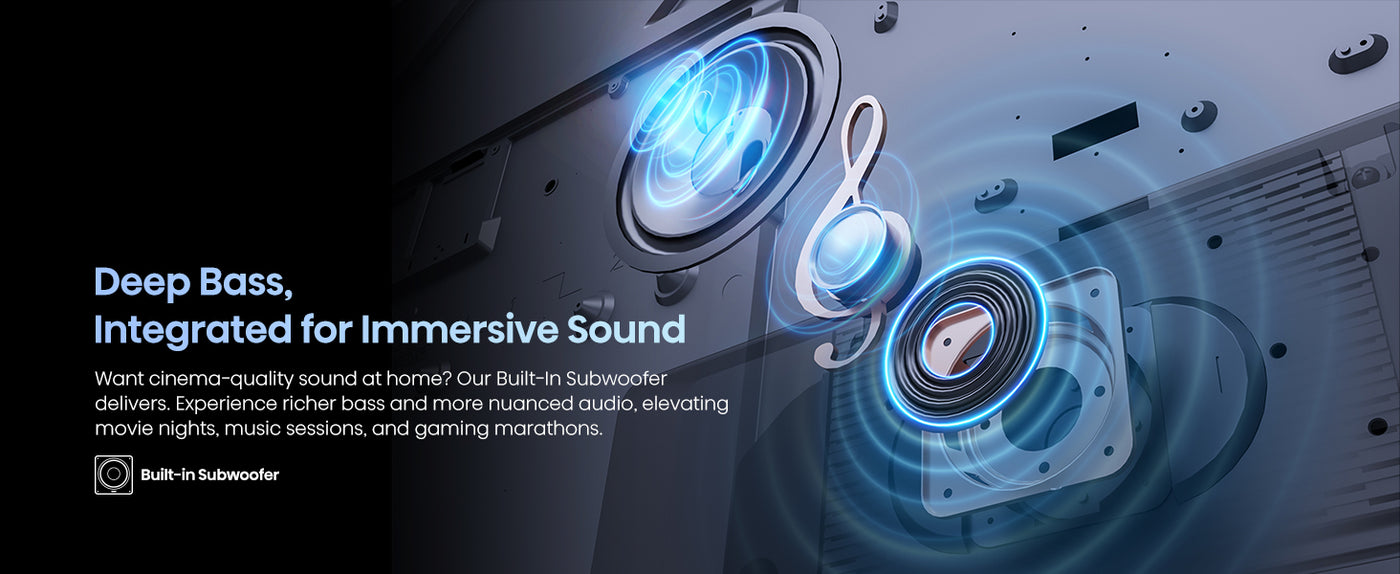 - Sound: 2.1 Channel | 61W Speakers Output(18W Speaker×2, 25W Subwoofer×1) | DTS X | Dolby Atoms | Dobly MS12 | Dobly AC-4 | NICAM/A2 Stereo Supported | User Equalizer | WiSA SoundSend