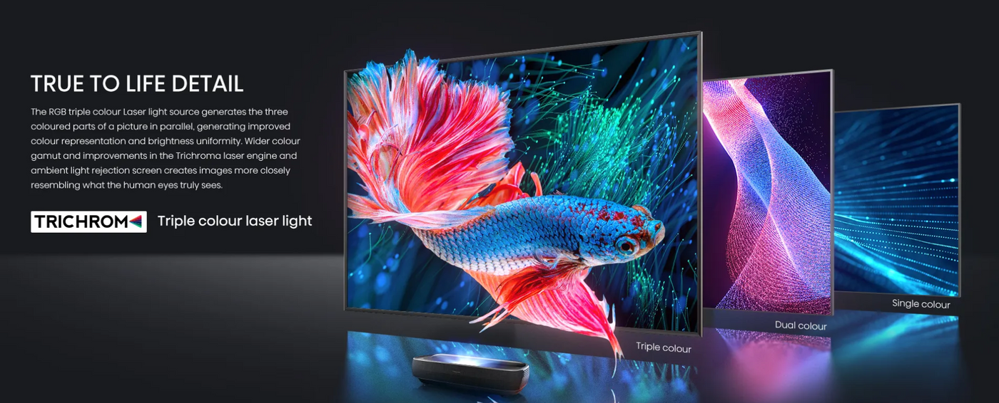 Featuring a 120 inch Trichrom ALR screen this Laser TV produces vibrant colors sharp contrast and exceptional brightness for clear viewing even in well lit rooms.