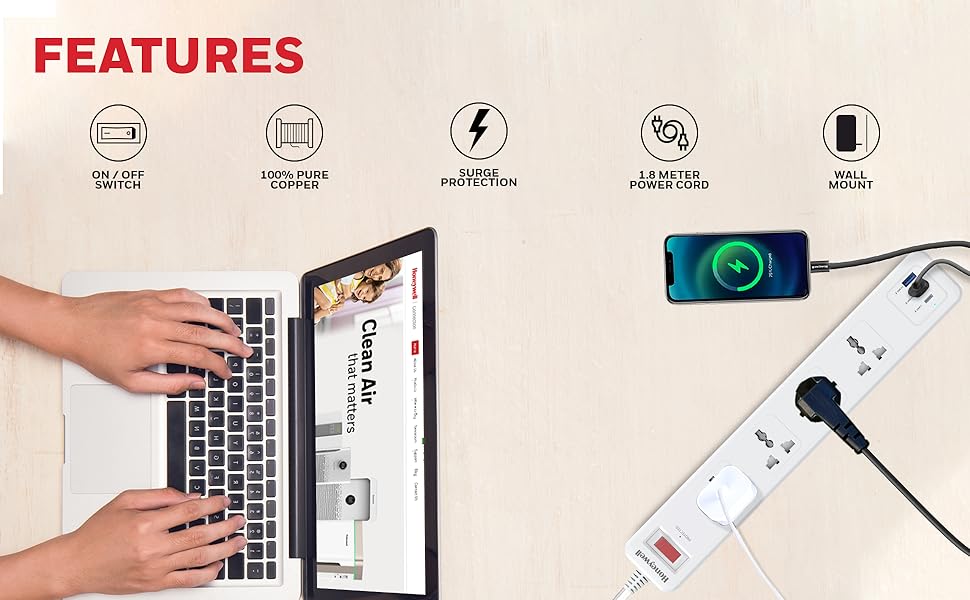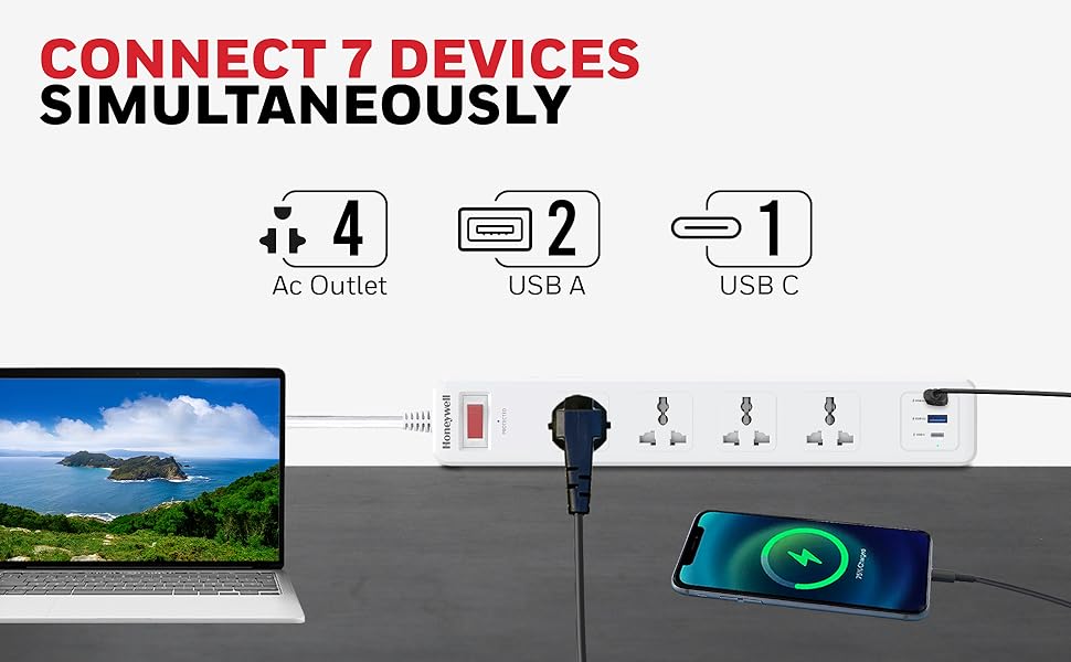 Honeywell 4 Out Surge Protector with Master Switch- Spike Guard/Extension Board- 4 Outlet- PD20W & 2xUSB- 13500Amp- 1.8 Meter Cord- DSW- Automatic Overload Protection- 3 Years Manufacturer Warranty