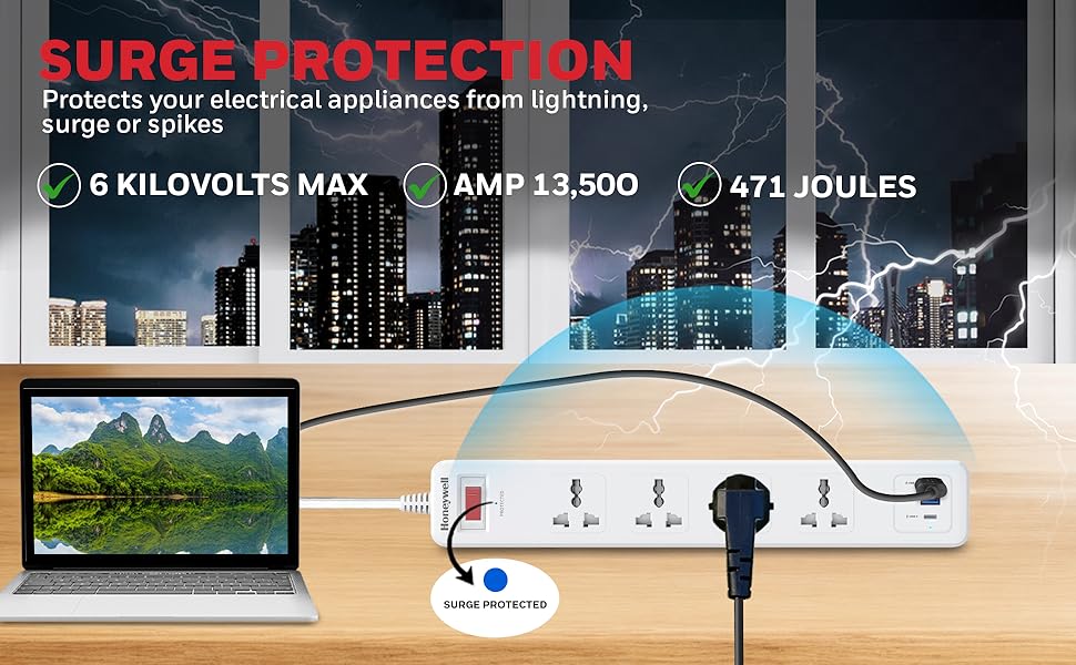- Protect your electric devices from power surges & current spikes(6KV Max) of upto 471J/13,500Amp