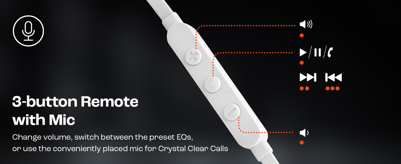 - 3-button remote with microphone : Use the conveniently placed microphone to take crystal-clear calls on the fly. Or control your music playback, change the volume, or switch your EQ presets, all at your fingertips