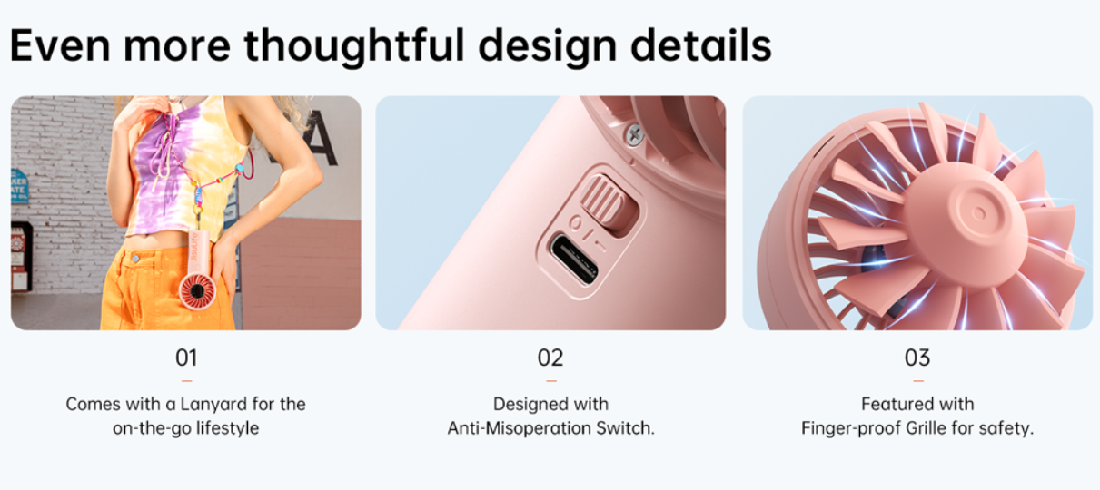 - Thoughtful Details and Enhanced Safety: For better user experience, It equipped with a hanging lanyard for convenient portability, an on-off switch designed to prevent accidental operation, and finger-safe grilles for enhanced safety