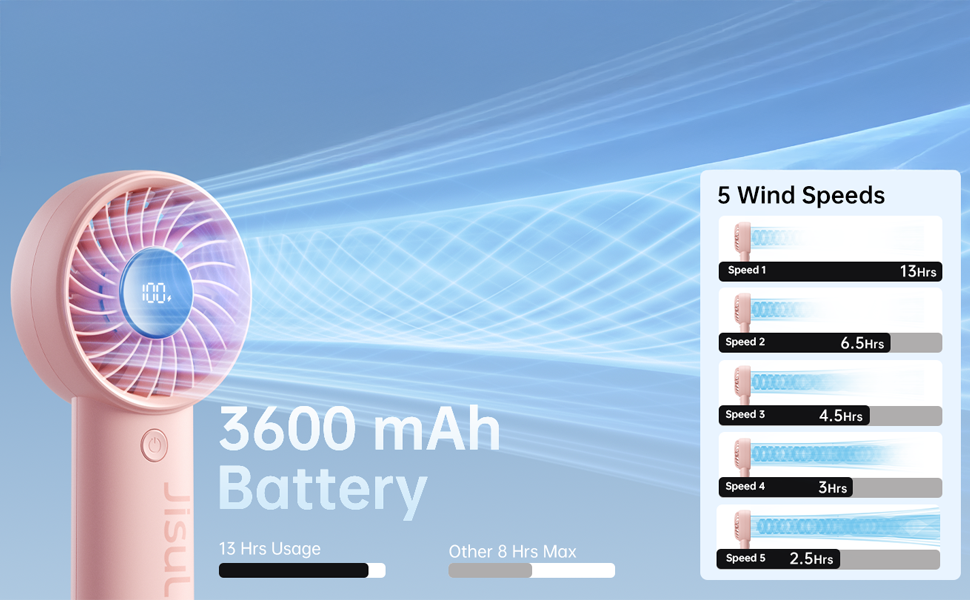 - 3600 mAh Long Battery Life: Support up to 13 hours of usage with a 3600 mAh battery, our handheld fan beats the competition with its outstanding battery life; Experience up to 13 hours of continuous cooling comfort throughout the day