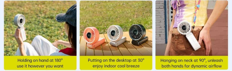 - 【3-IN-1 Solution: Hand-held/Neck/Desk Fan】 Hang it around your neck for hands-free cooling during hikes or use it on your desk for a focused breeze while studying. Its innovative design allows for handheld use, desktop placement, or worn around the neck, providing a 3-IN-1 solution for beating the heat.
