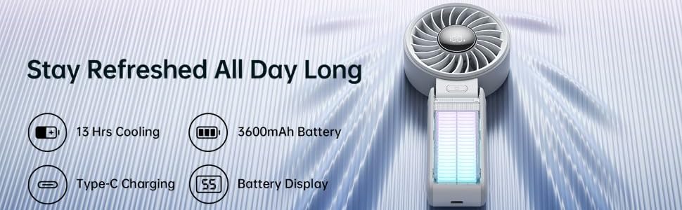 - 【Long Lasting Cooling: 19.5Hrs Max】 From early morning commutes to late-night camping trips, enjoy up to 19.5 hours of cooling at speed 1. This personal fan is a lifesaver for long office days, school sessions, or any extended outdoor activity where staying cool is key.