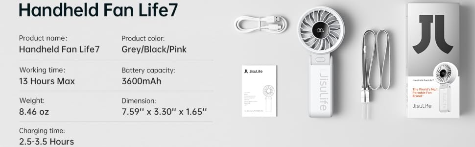 JISULIFE Handheld Fan Life7,2024 Powerful Portable Fan with LED Display[19.5Hrs Max Cooling] 3600mAh,5 Speeds,Lanyard; 3-in-1 Hand/Desk/Neck Fan,Travel Essentials Gifts for Women,Men