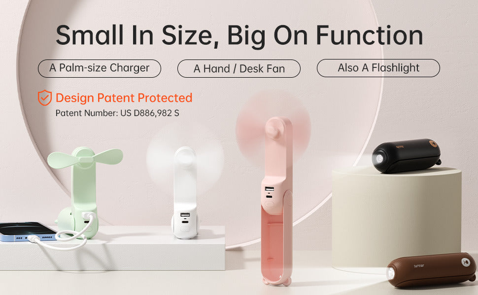 - Power Bank Function and Quiet Operation: 5V/1A USB output port makes the mini fan a power bank(4500mAh) in emergency, supplying power for mobile phone, MP3, or iPod, etc. With no frame design, makes the noise to 50 db which causes no bothering during work