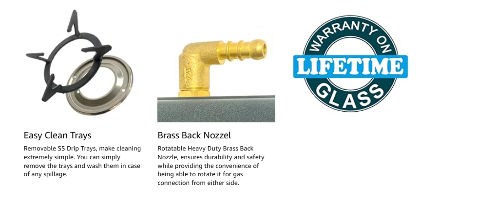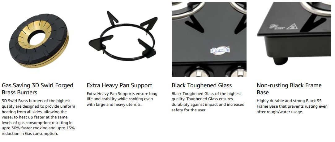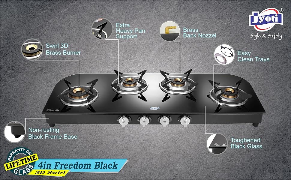 - Jyoti 4 IN Freedom is designed with a spacious design so that you get the most out of your cooktop. A unique horizontal design gives you the maximum possible space between burners. Other features include Gas Saving 3D Swirl Brass Burners, Easy-Clean Trays, Heavy Pan Supports, and Black Toughened Glass with a sleek black SS Frame Base that allows for an uninterrupted and smooth cooking experience.