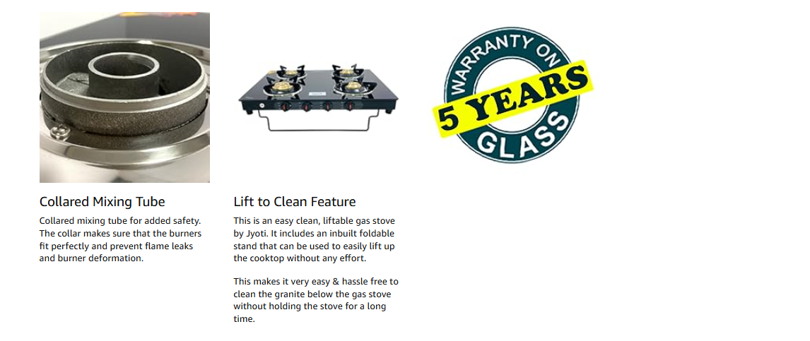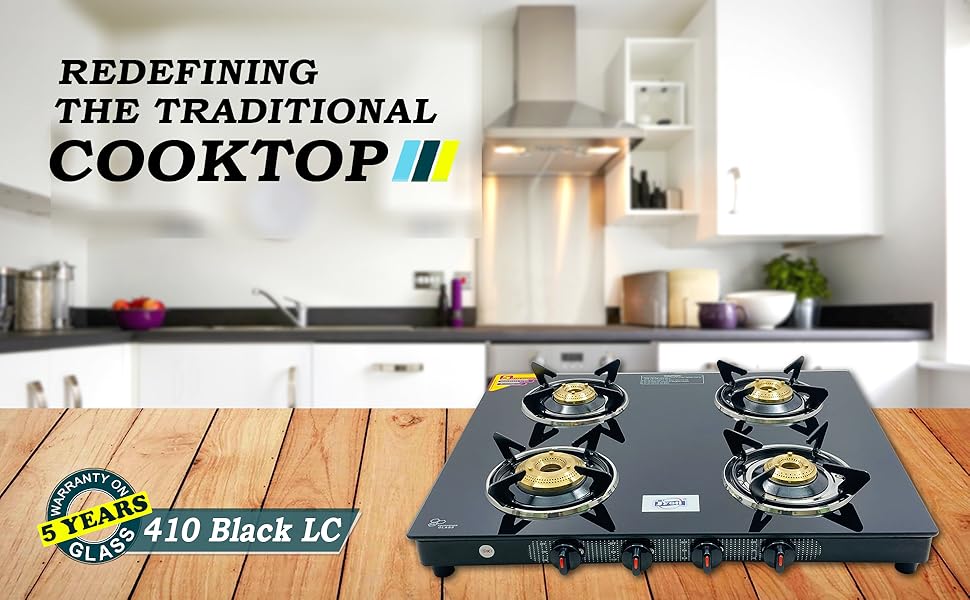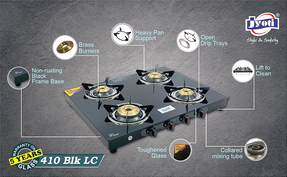 Jyoti 410 Black LC with lift to clean Stand | 4 Burner Glass Gas Stove | Toughened Glass Cooktop with 5 year Manufacturer's Warranty on Glass | Brass Burners (4 Burner)