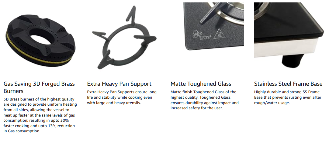 - Premium matte finish toughened glass enhances the stove’s aesthetics.