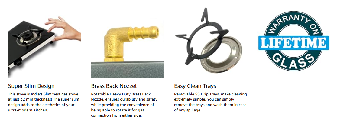 - India’s slimmest gas stove, with an ultra-sleek 32mm thickness.