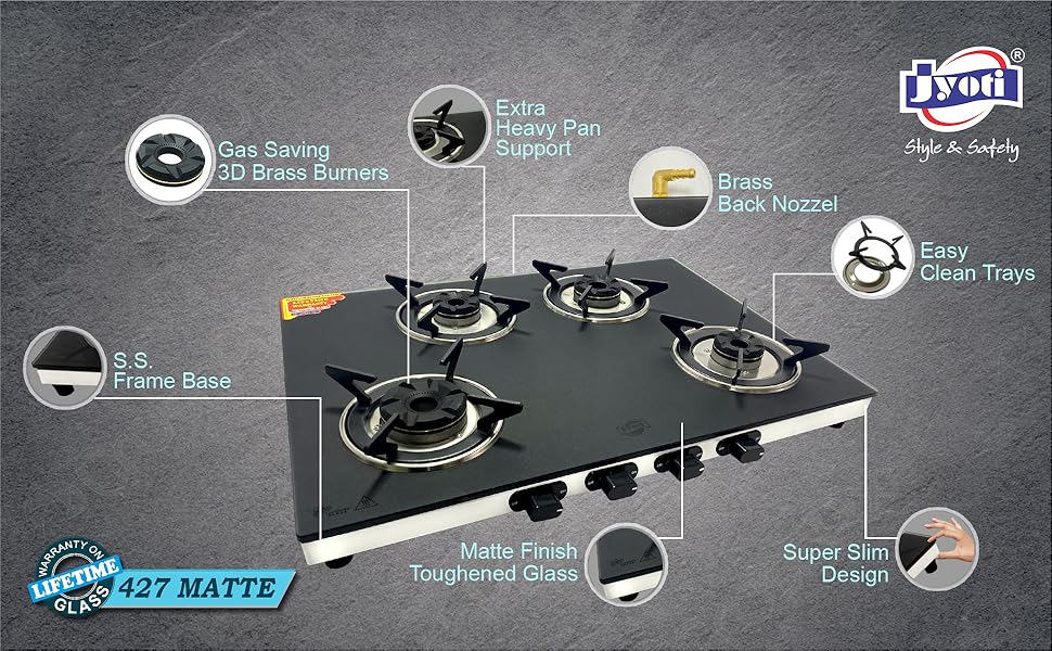 Jyoti 427 Sleek Matte 3D | 4 burner Gas Stove | Toughened Glass Cooktop | Gas Saving 3D Tornado Brass Burners with SS Frame Base (427 Matte 3D)