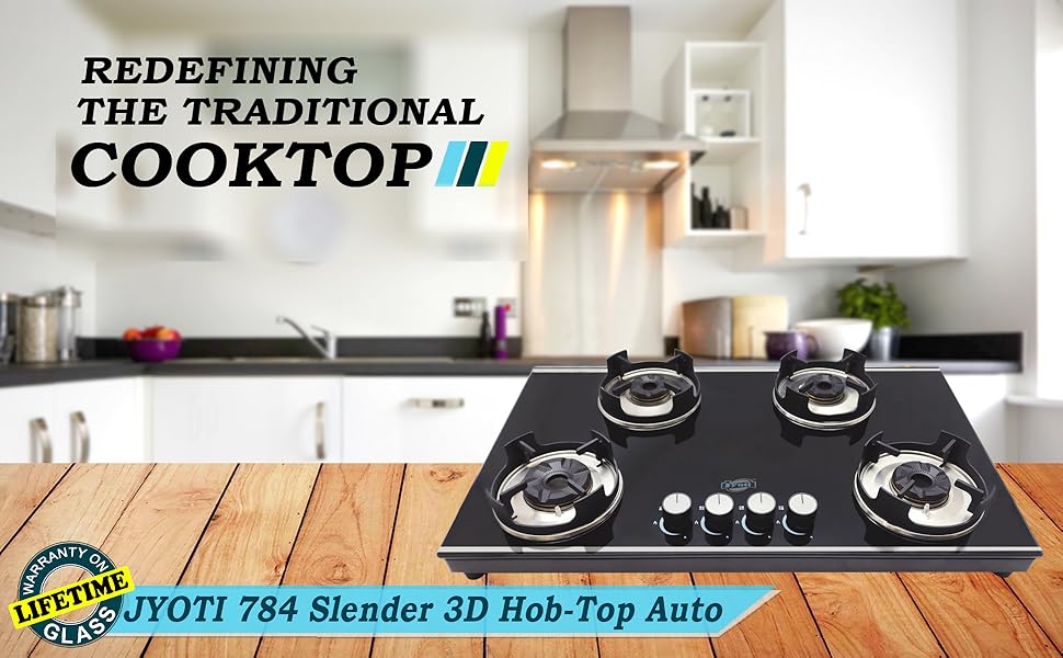 Jyoti 784 Slender Mirror Hobtop | Tornado Brass Burners Suitable for Indian Cooking | Automatic Multi-spark Ignition | 2-in-1 Built-in or Tabletop | Toughened Glass (Auto)