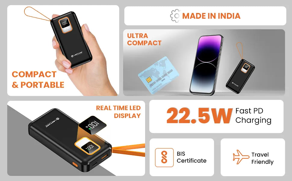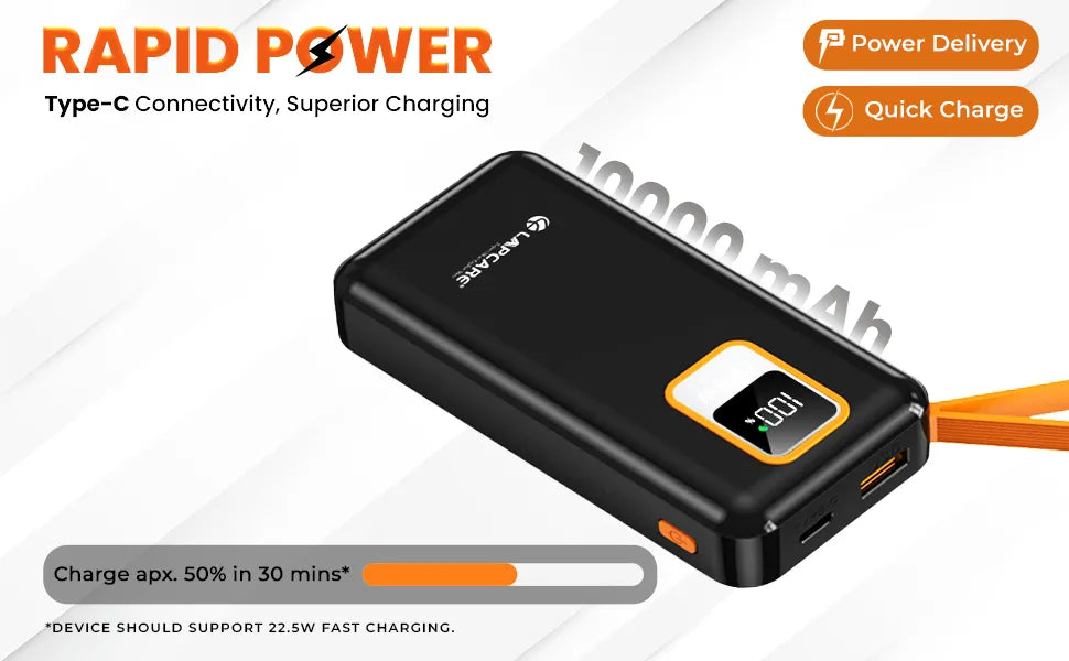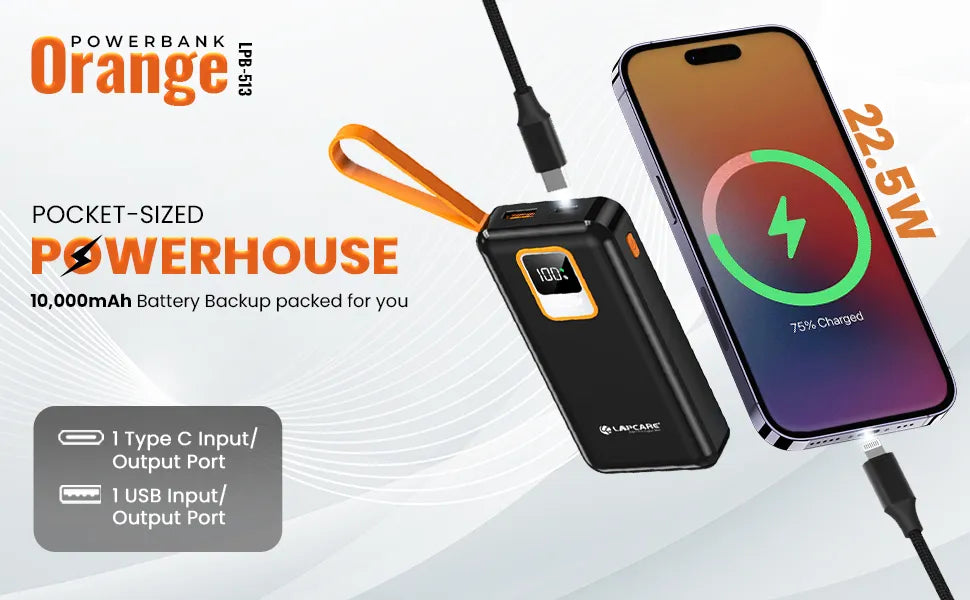 Get the power you need on-the-go with LAPCARE ORANGE 10000 mAh Power Bank. Featuring 2 ports - Type C & USB - and fast charging, you can get 50% battery life in just 30 minutes. Plus, stay informed on your battery life with the real-time LED display. The ultra compact and portable design makes it easy to take with you wherever you go. Never be without a charge again with this convenient and efficient power bank.