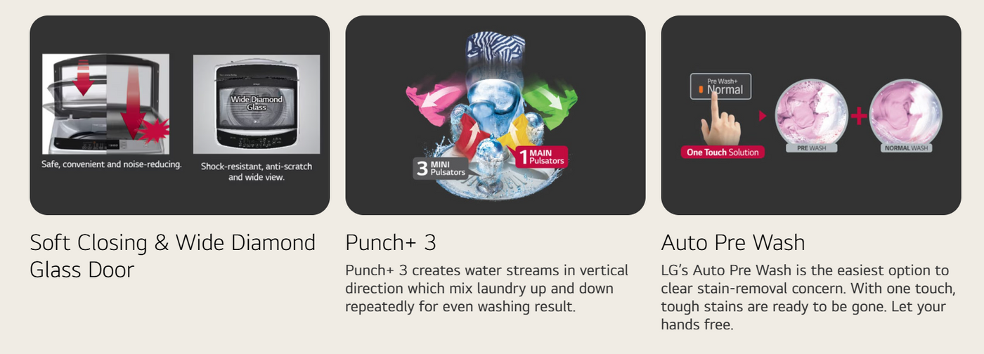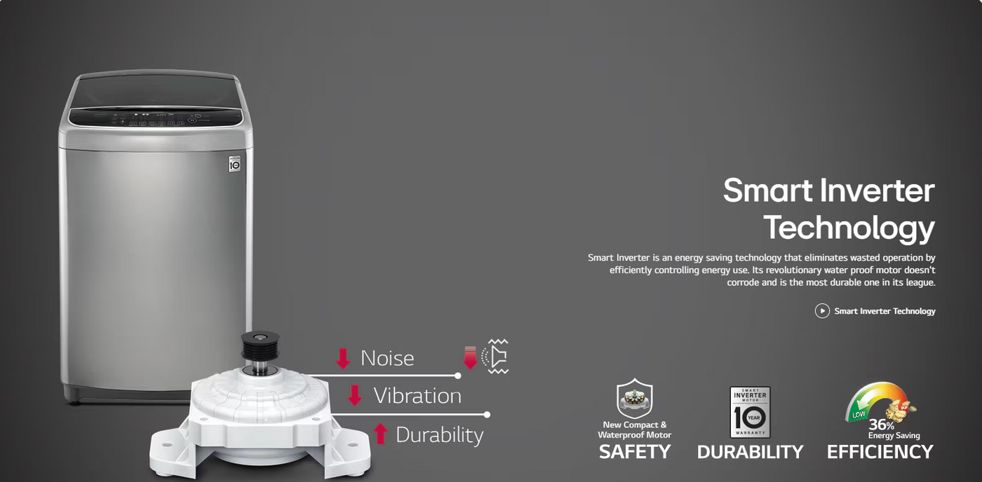 Efficiently tackle your laundry with the LG 8Kg Top Load Washing Machine. The innovative Smart Inverter Motor ensures powerful washing while saving energy. With Turbodrum and Auto Pre Wash, get a thorough clean every time. Soft Closing Door and Smart Diagnosis add convenience to your laundry routine.