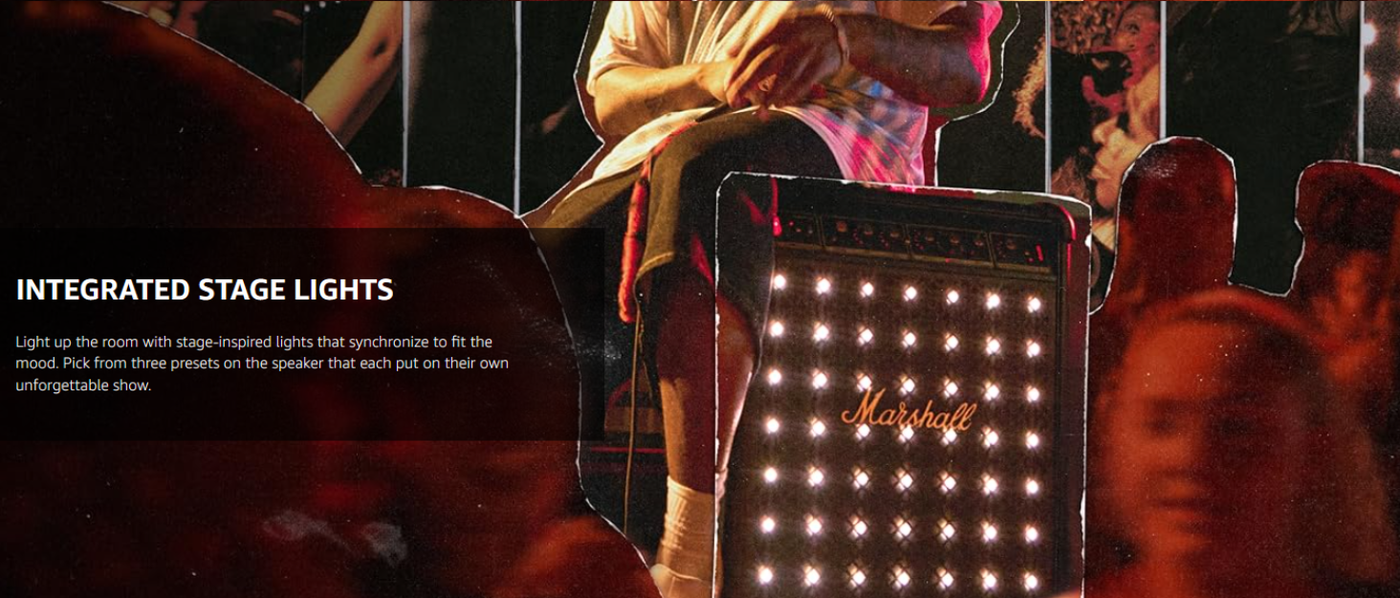 Integrated LED lighting adds visual excitement while adjustable bass and treble controls allow users to fine tune sound according to personal preference and environment. The rugged enclosure with signature Marshall styling offers durability while maintaining a premium aesthetic.