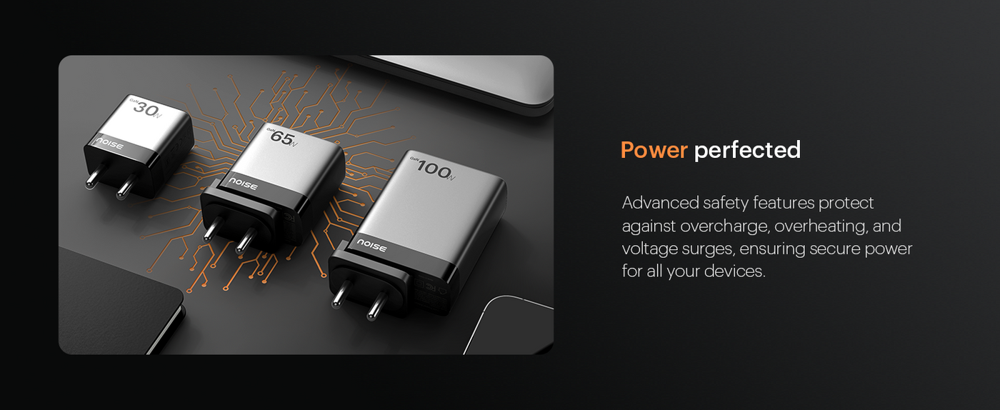 - Fast Charging: Power up your device up to 50% in just 27 minutes*. The maximum rated capacity of the adapter is 100w. The max output required for laptop & phone fast charging will be achieved only when using a certified and compatible cable rated for 100w+ output. For best results use Original Noise 100w Braided Cable compatible with all adapters. (*0-50% in 30mins achieved via internal testing on iphone 14 pro using Original Noise 100w cable)