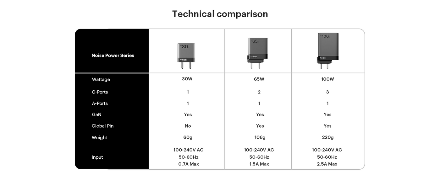 Noise Power Series GaN Charger: 2 Ports (1 USB-C Type, 1 USB-A), iphone 0-50% in 30mins, Globally Compatible, Supports All iPhones, Android Phones, Tablets