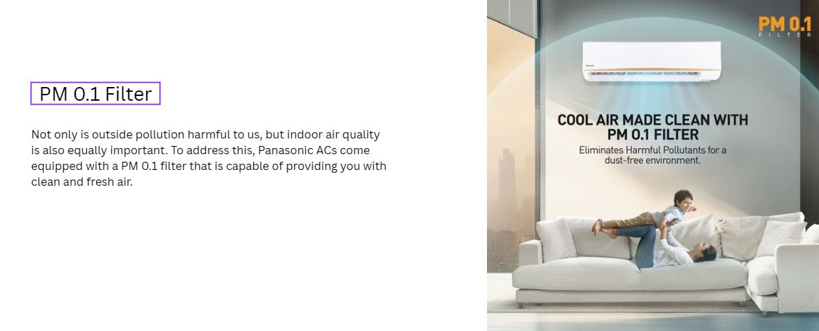 Equipped with a PM0.1 filter and dust protection, this AC helps capture fine airborne particles, promoting healthier indoor air quality for you and your family. Its efficient airflow system helps spread cool air evenly across your living space, making it suitable for medium to large sized rooms.