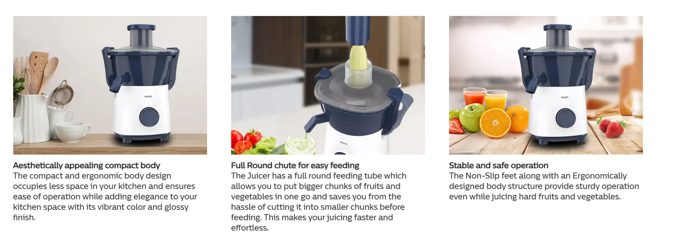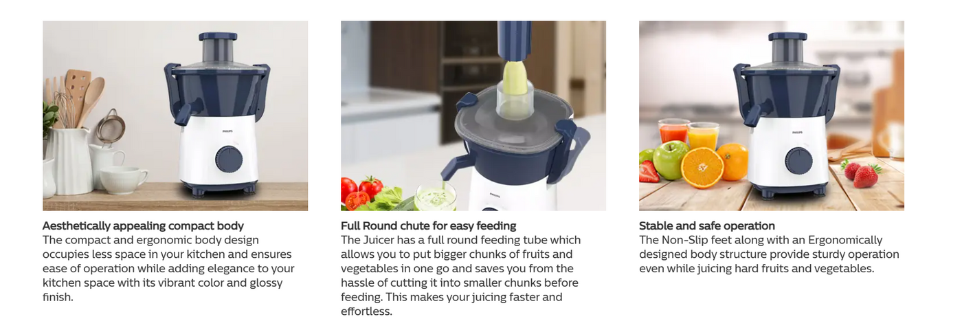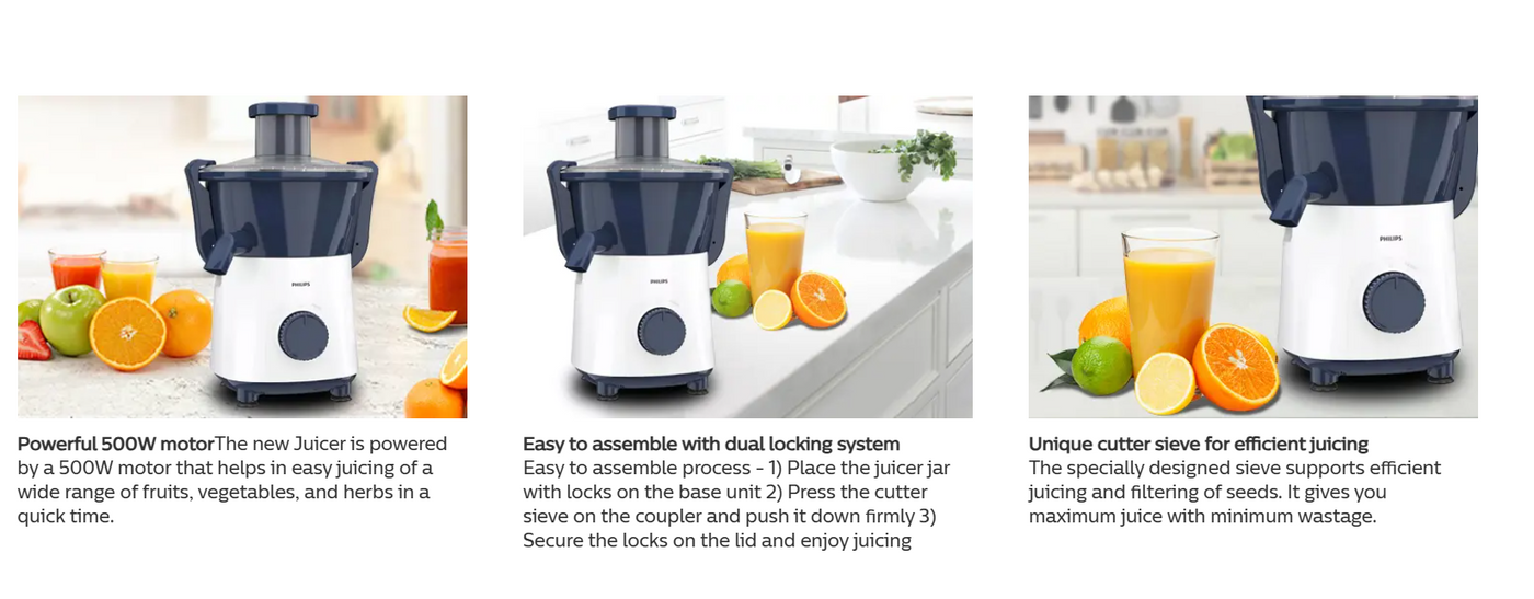 More Variety, More Juicing Introducing the all new Philips Juicer which is powered with a 500W motor that helps you prepare a wide range of juices - Fruits, vegetables and herbs in quick time. The compact and colorful Juicer is sturdy and easy to assemble. 1-Powerful 500W motor 2-Easy to assemble with dual locking system 3-Unique cutter sieve for efficient juicing 4-Aesthetically appealing compact body 5-Full Round chute for easy feeding 6-Stable and safe operation 7-Easy maintenance and care.