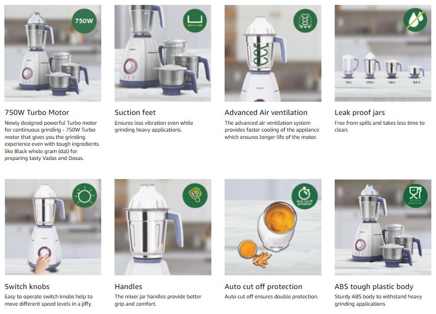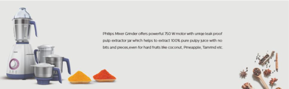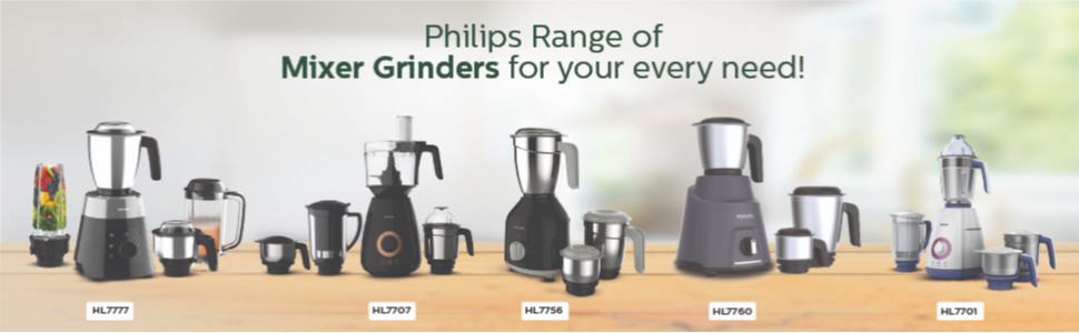 Philips HL7701/00 Mixer Grinder is styled in an elegant lavender and white body, bringing a modern look to your countertop while maintaining solid build quality for long term use. Comfortable handles and secure lids make operation easy and safe.