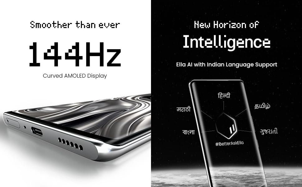 - Display (144Hz Curved AMOLED Display) : A screen that melts into the edges. Ultra-responsive. Flicker-free. Made to move with you, whether you’re scrolling, gaming, or simply vibing.