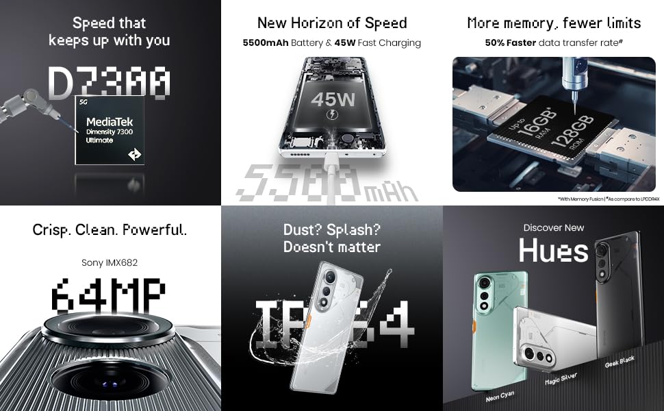 - Processor (D7300 Ultimate Processor + 16GB RAM* with 128GB ROM) : Engineered with the MediaTek D7300 Ultimate chipset and built on a 4nm process, it’s lean, mean, and lightning fast. Paired with 16GB RAM* (with memory fusion) and 128GB storage, multitasking feels smooth, apps load instantly, and gaming stays lag-free.