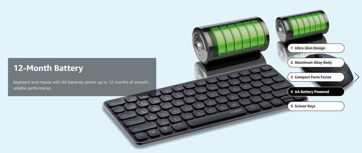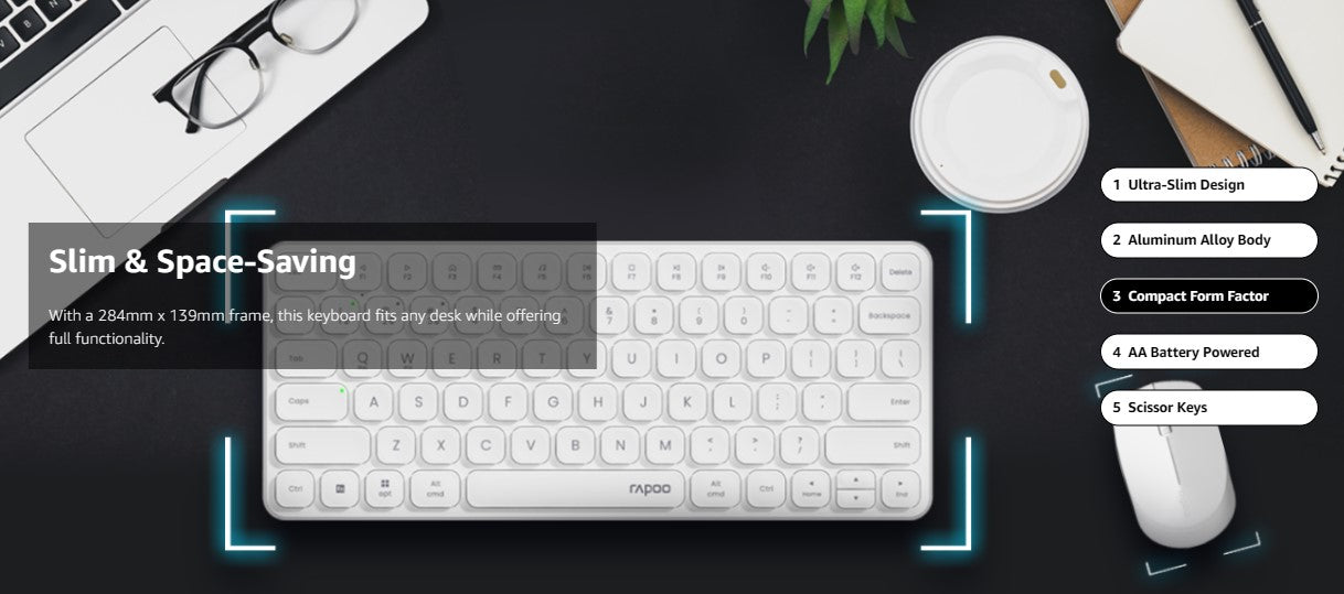Rapoo 9320M Bluetooth 4.0, 5.0 + 2.4G Wireless Multi-Mode Keyboard Mouse Combo, Aluminum Base, 2400 DPI, 10M Range, Compact