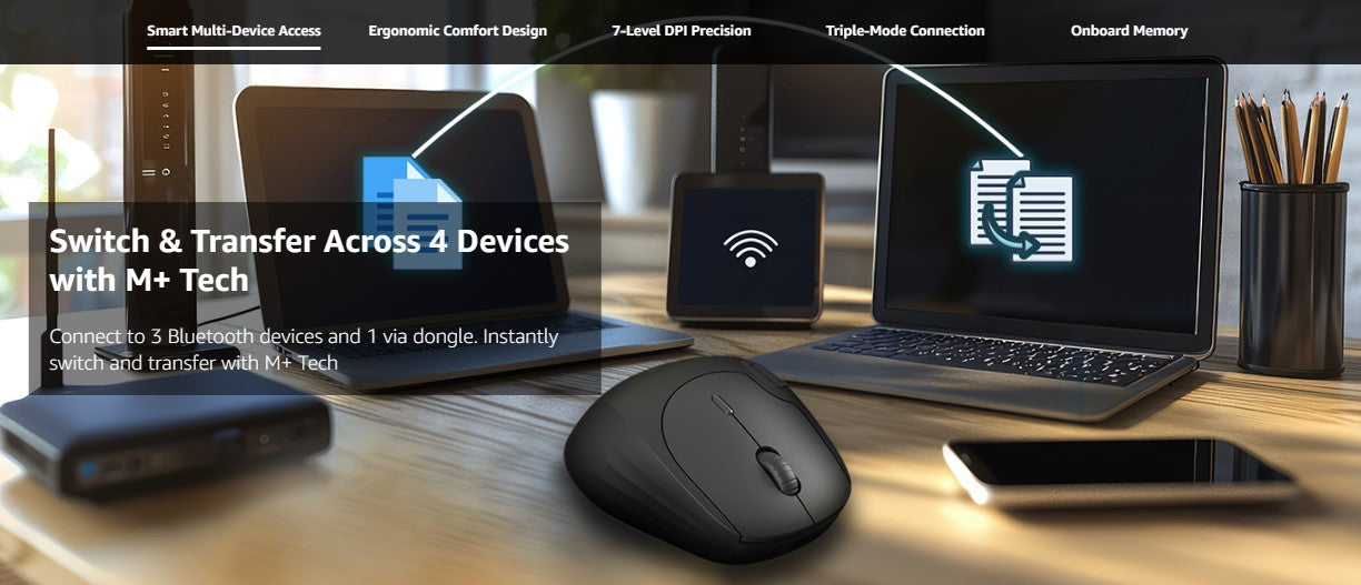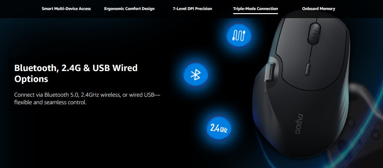 - Multi-mode: the computer mouse connects via Bluetooth 3.0, 4.0 and 2.4 GHz wireless via USB, range up to 10 meters / 360° coverage