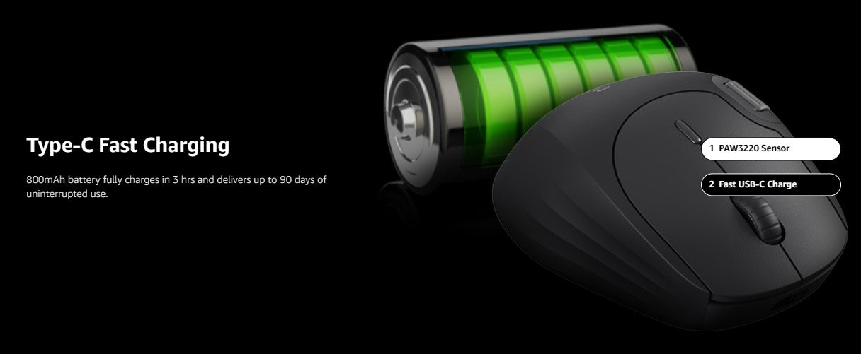 - No battery change of the computer mouse: thanks to the integrated environmentally friendly lithium battery, a full charge can last up to 25 days