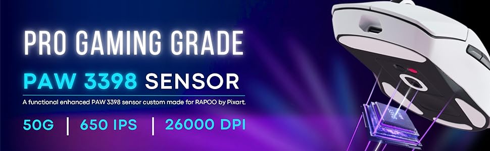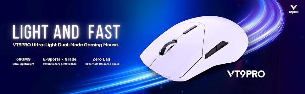 The Rapoo VT9PRO Wireless Gaming Mouse is designed for gamers seeking ultra-responsive performance and feather-light agility. With a high-precision PAW3398 esports-grade sensor, this wireless gaming mouse delivers tracking from 50 up to 26000 DPI, giving you complete control whether you’re sniping in shooters or navigating strategies in MOBAs. The lightweight 68 g design lets you play for hours without fatigue.