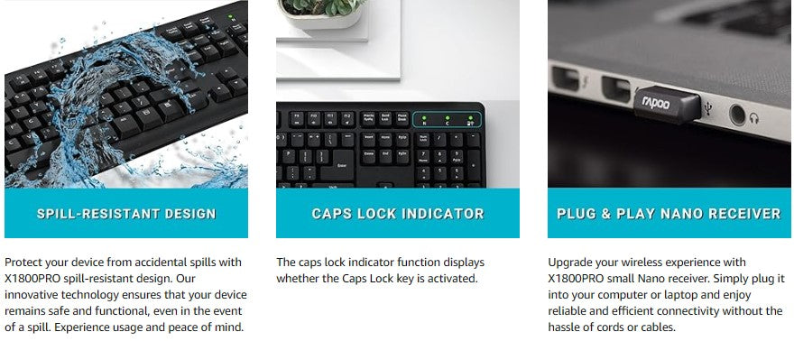 Rapoo X1800PRO Wireless Keyboard Mouse Combo,LED Indicator,Multimedia Keys, Spill-Resistant Design,12 Months Battery Life, 1000 DPI Tracking Engine, Plug-and-Forget Nano Receiver, 3 Year Warranty